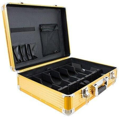 Large Master Case Leather finished interior Flip latches with locks and keys Removable compartment with hook latch: 6 tall pockets 12 short pockets Foam padded lid for security Main compartment: 4 leather holders Elastic security band 1 zippered mesh pocket Elevating clipper case with round notches for cord organization 19 ¼” x 6 ¼” x 15″ 10 lbs